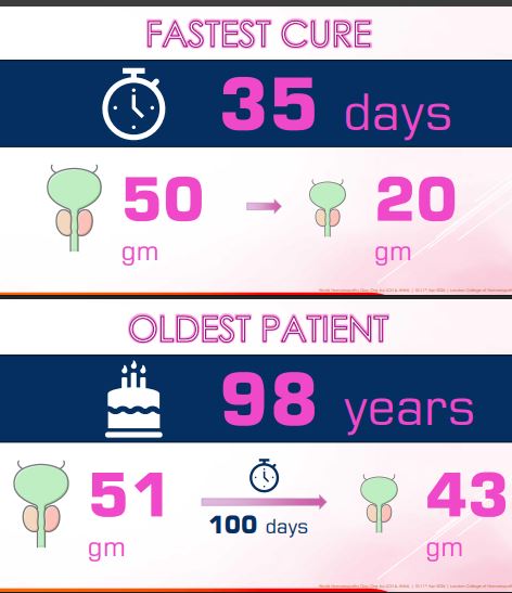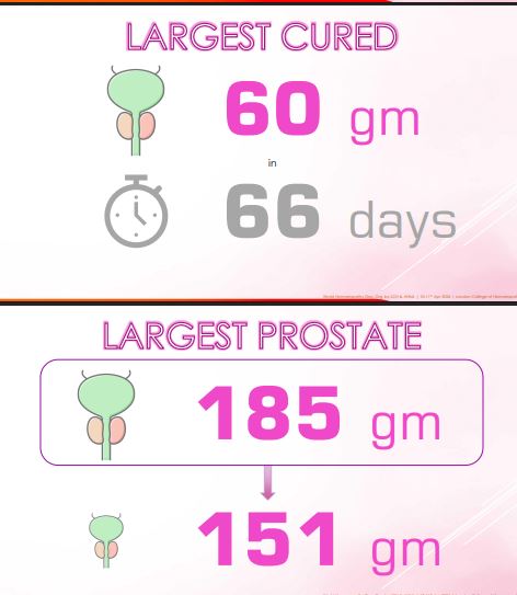 डॉ गिरीश ने बताया कि इन मरीजों में सबसे कम समय में नॉर्मल होने वाले मरीज का प्रोस्टेट 50 ग्राम का था जो कि 35 दिनों के इलाज के बाद 20 ग्राम का हो गया। इसी प्रकार सर्वाधिक आयु वाले मरीज की उम्र 98 वर्ष थी जिसका प्रोस्टेट 51 ग्राम का था, जो 100 दिनों के इलाज में 43 ग्राम आ गया। इसके अलावा सबसे बड़ा साइज का प्रोस्टेट जो 66 दिनों के उपचार के बाद नॉर्मल साइज का हो गया वह 60 ग्राम का था, इसके अतिरिक्त सबसे बड़े साइज का प्रोस्टेट जो उपचार के बाद नॉर्मल तो नहीं हुआ लेकिन कम हुआ वह 185 ग्राम का था जो कि कम होकर 151 ग्राम हो गया।