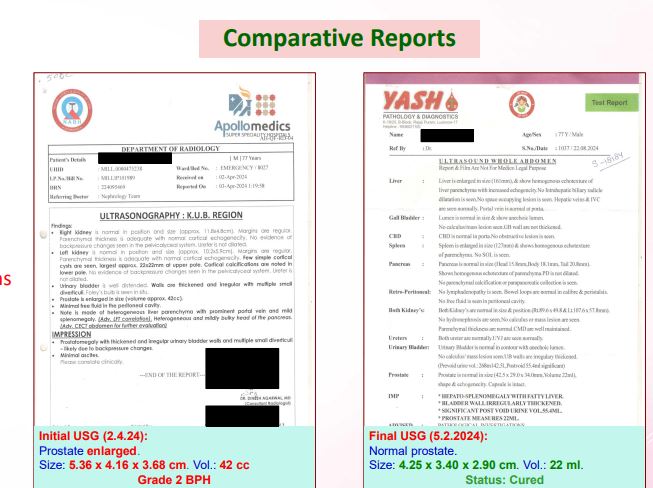 यह स्टडी बीती 10 एवं 11 अप्रैल, 2026 को लंदन में आयोजित विश्व होम्योपैथिक दिवस समारोह में प्रस्तुत की गयी। अप्रैल 1993 से मार्च 2026 तक की अवधि की इस स्टडी में मरीजों का पूरा रिकॉर्ड साक्ष्य सहित उपलब्ध है। प्रोस्टेट बढे होने की पुष्टि और उपचार के बाद प्रोस्टेट कम होने की पुष्टि के साक्ष्य के रूप में अल्ट्रासोनोग्राफी के