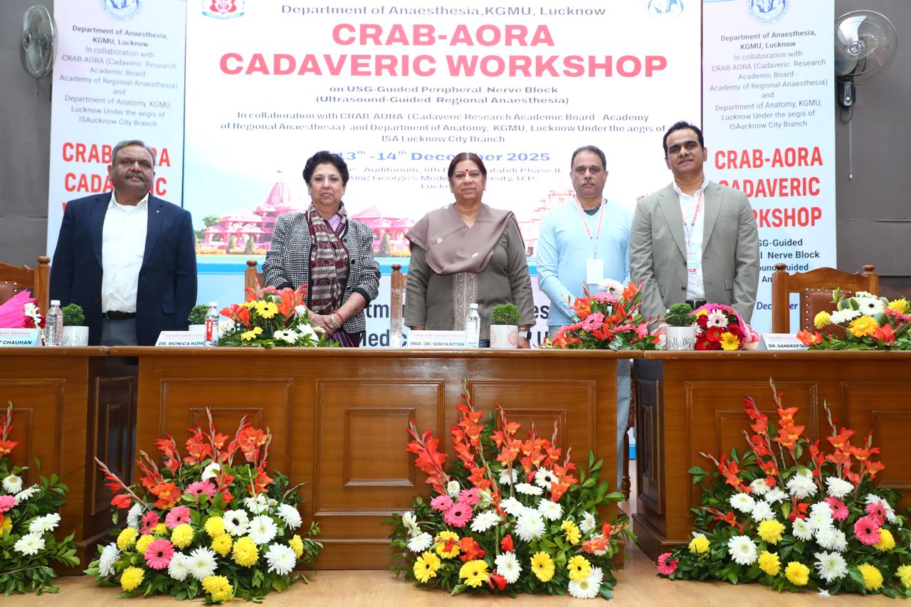 लखनऊ। किंग जॉर्ज चिकित्सा विश्वविद्यालय (केजीएमयू), लखनऊ में 13–14 दिसम्बर 2025 को अल्ट्रासाउंड-गाइडेड रीजनल एनेस्थीसिया पर आधारित एडवांस कैडैवेरिक कार्यशाला का सफल आयोजन किया गया। इस महत्वपूर्ण शैक्षणिक कार्यक्रम का उद्घाटन माननीय कुलपति प्रो. सोनिया नित्यानंद द्वारा किया गया।