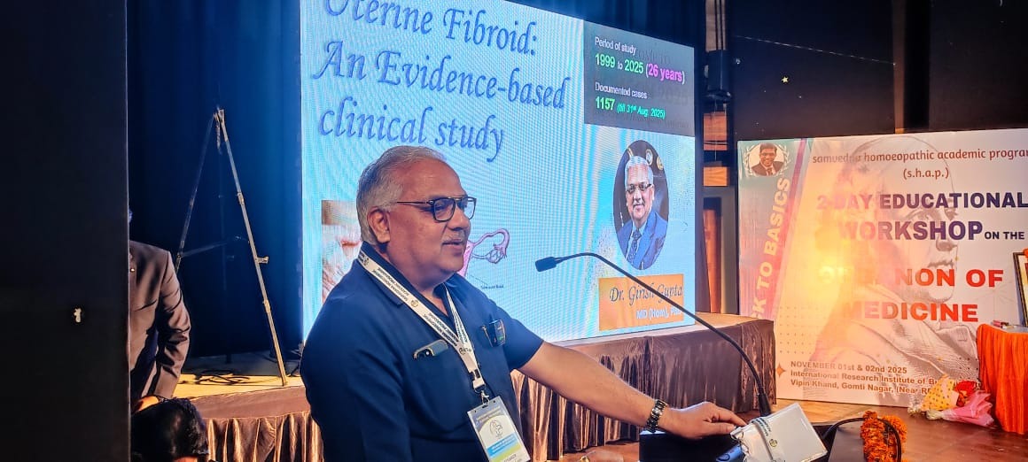 डॉ गिरीश गुप्ता ने यह बात यहां गोमती नगर स्थित अंतर्राष्ट्रीय बौद्ध संस्थान के सभागार में 1 एवं 2 नवम्बर को डॉ गौरी शंकर द्वारा संचालित संवेदना होम्योपैथिक ऐकेडमिक प्रोग्राम के तत्वावधान में ऑर्गेनन ऑफ मेडिसिन विषय पर आयोजित दो दिवसीय वर्कशॉप में यूट्राइन फाइब्रॉयड (बच्चेदानी में गांठ) रोग के इलाज पर व्याख्यान के दौरान कही। डॉ गिरीश ने अपने व्याख्यान में हार्मोन के असंतुलन के चलते होने वाली यूट्राइन फाइब्रॉइड बीमारी से ग्रस्त 1157 केसेज की स्टडी के बारे में प्रेजेन्टेशन दिया। उन्होंने कहा कि बहुत से लोग यह जानने की कोशिश करते हैं कि मैंने रोग विशेष के लिए किस दवा की खोज की है, लेकिन ऐसा नहीं है एक रोग में एक दवा सभी को फायदा करे यह संभव नहीं है, मैंने जो रिसर्च में सफलता हासिल की है वह मरीज के रोग के सही कारण तक पहुंचने और उसके अनुसार दवा का चुनाव करने के होम्योपैथिक सिद्धांत का पालन करने का परिणाम है। उपचार की दिशा मरीज के होलिस्टिक लक्षणों के आधार पर तय जाती है।