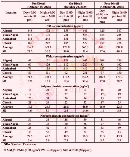 नतीजों से पता चला कि दिवाली के दौरान हवा की क्वालिटी में काफी गिरावट आई, जिसमें PM10 और PM2.5 नेशनल एम्बिएंट एयर क्वालिटी स्टैंडर्ड (NAAQS) 100 µg/m³ और 60 µg/m³ से ज़्यादा थे। दिवाली की रात, सभी जगहों पर पार्टिकुलेट मैटर का लेवल बहुत ज़्यादा रिकॉर्ड किया गया, जिसमें PM10 अलीगंज (645 µg/m³) में सबसे ज़्यादा था, इसके बाद अमीनाबाद (560 µg/m³), विकास नगर (534 µg/m³), और चौक (522 µg/m³) थे, जो दिवाली से पहले के लेवल से लगभग 183% ज़्यादा था। PM2.5 अलीगंज में सबसे ज़्यादा 462 µg/m³ तक पहुँच गया, जिसका एवरेज वैल्यू 352.5 µg/m³ था, जो दिवाली से पहले की रातों से 177% ज़्यादा दिखाता है। गैसीय पॉल्यूटेंट CPCB लिमिट (80 µg/m³) के अंदर रहे, लेकिन उनमें काफ़ी बढ़ोतरी हुई, दिवाली की रात SO₂ 74.9% और NO₂ 39% बढ़ गया। सभी जगहों पर शोर का लेवल स्टैंडर्ड से ज़्यादा था, विकास नगर में सबसे ज़्यादा 89.3 dB(A) और चौक में सबसे कम 75.8 dB(A) था।