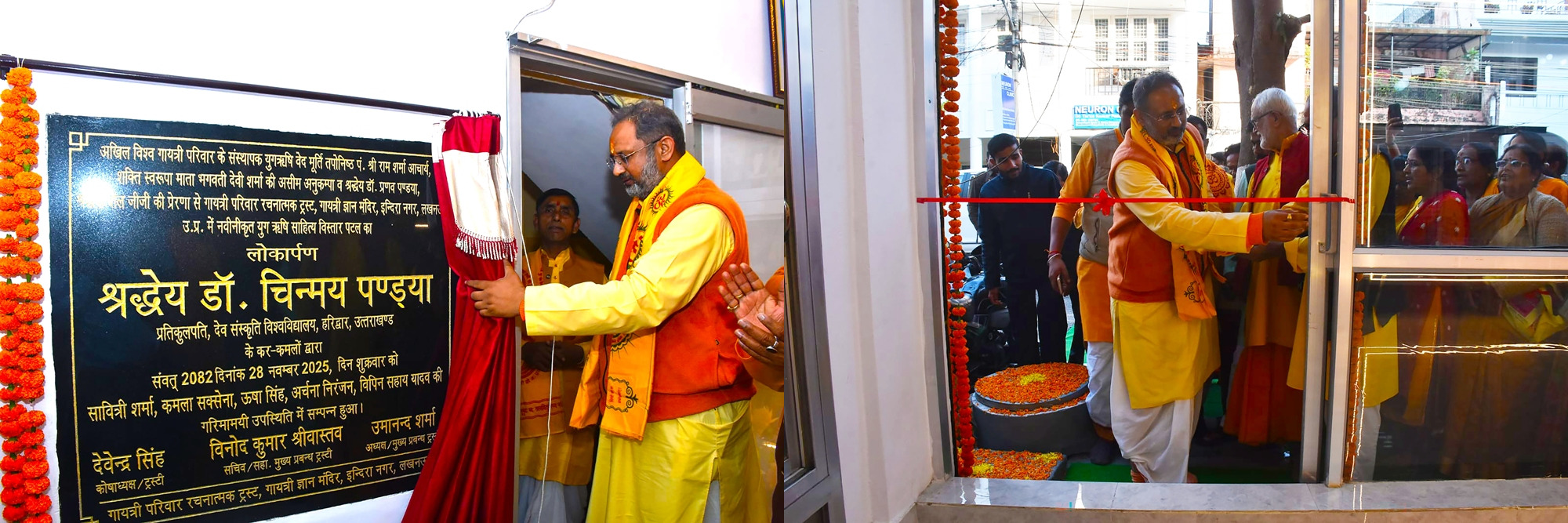 लखनऊ। अखिल विश्व गायत्री परिवार शांतिकुंज हरिद्वार के विशेष प्रतिनिधि एवं देव संस्कृति विश्वविद्यालय हरिद्वार के प्रतिकुलपति डॉ० चिन्मय पण्ड्या ने आज इन्दिरानगर सेक्टर-9 स्थित गायत्री ज्ञान मंदिर में नवीनीकृत साहित्य विस्तार पटल का लोकार्पण किया। उन्होंने उपस्थित कार्यकर्ताओं को वंदनीया माताजी की जन्म शताब्दी तथा अखण्ड ज्योति के शताब्दी वर्ष में सभी का हर्षोल्लास के साथ भागीदारी के लिए आह्वान किया और युगऋषि का सन्देश दिया।